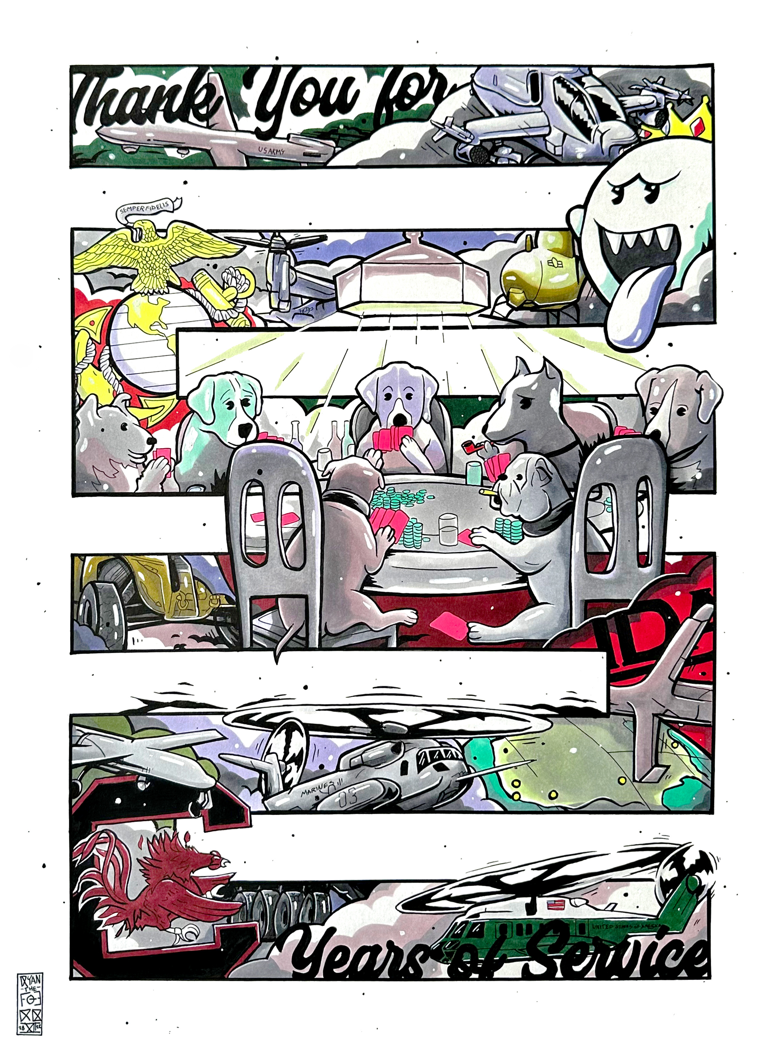 Commissioned Retirement gift to highlight 22 years on the job featuring details from their life and things they love.
